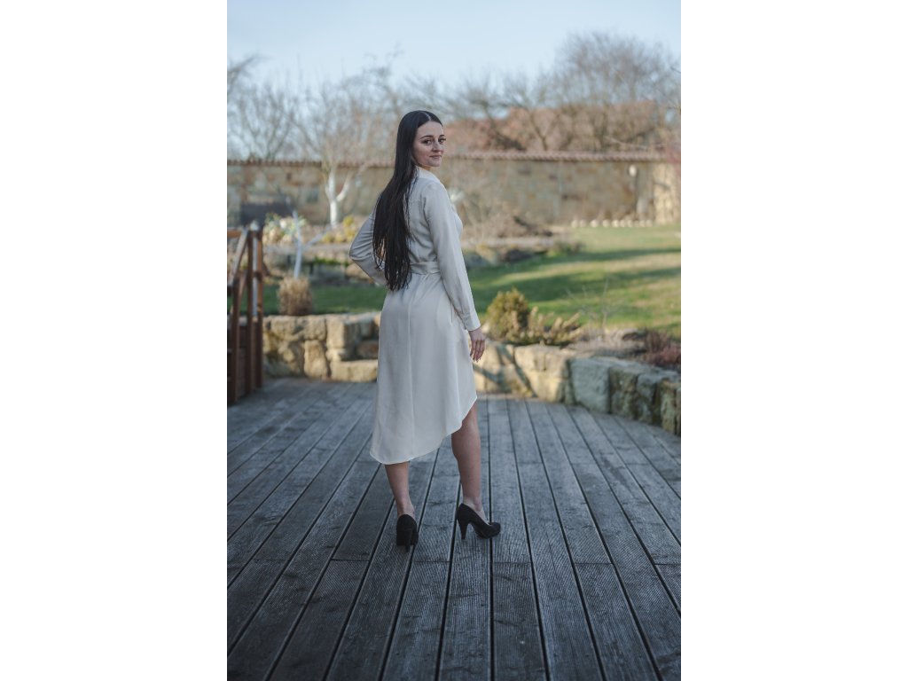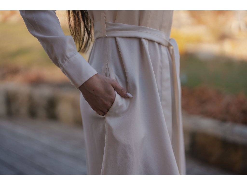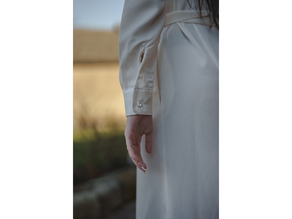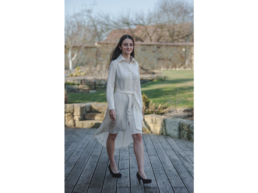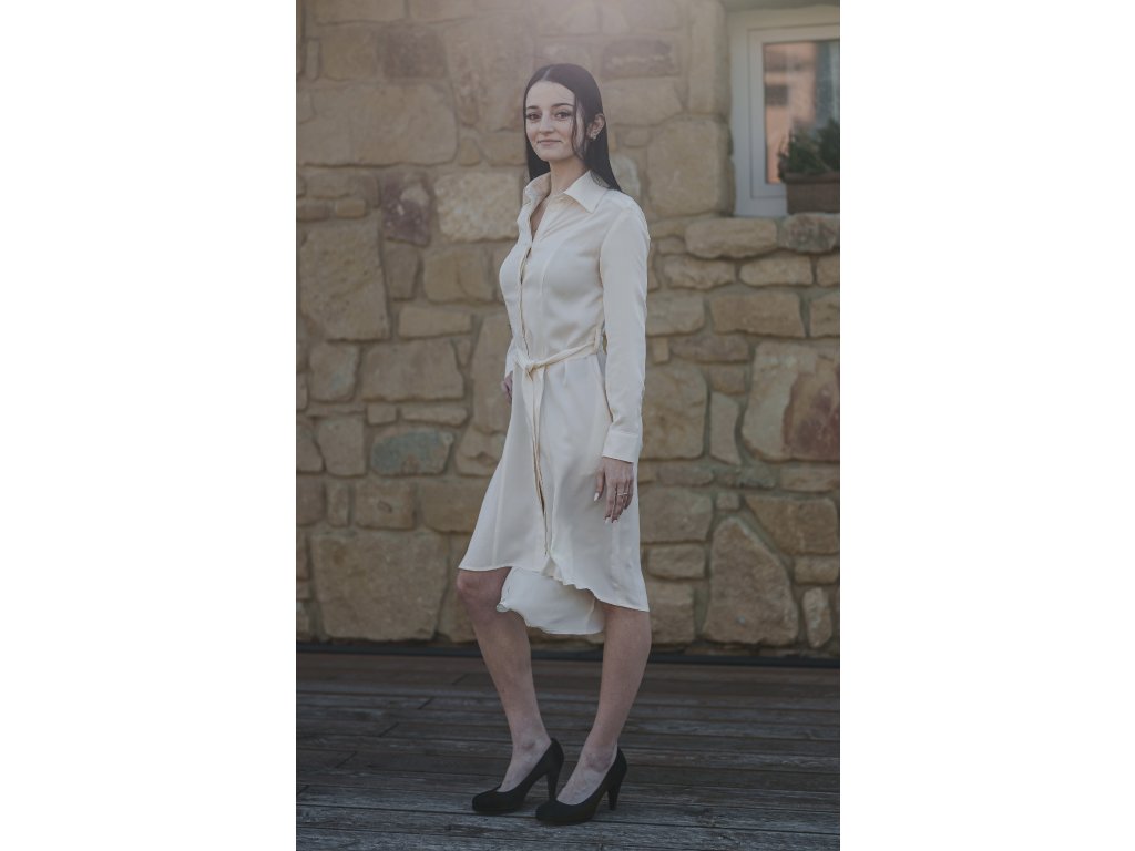 Košilové šaty v odstínu jemné smetany, které nechávají vyniknout ženskou siluetu s lehkostí a sebevědomím. Hebký materiál s přirozeným leskem působí luxusně, ale stále přirozeně. V pase stažené páskem, který zdůrazní siluetu, aniž by omezoval v pohybu.