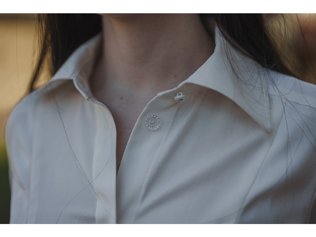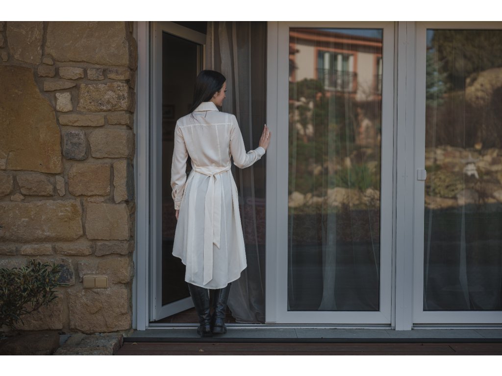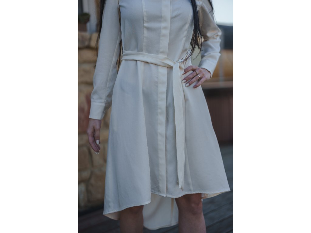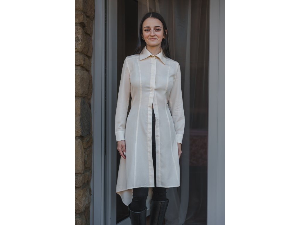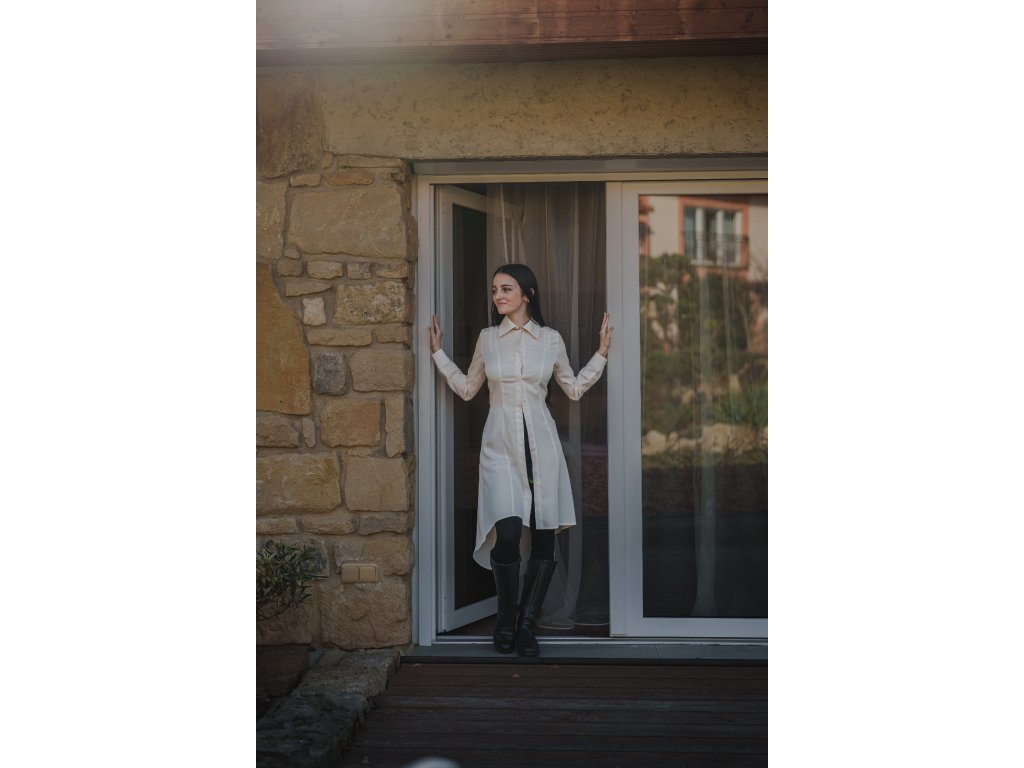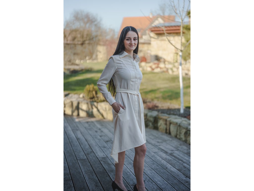 Košilové šaty v odstínu jemné smetany, které nechávají vyniknout ženskou siluetu s lehkostí a sebevědomím. Hebký materiál s přirozeným leskem působí luxusně, ale stále přirozeně. V pase stažené páskem, který zdůrazní siluetu, aniž by omezoval v pohybu.